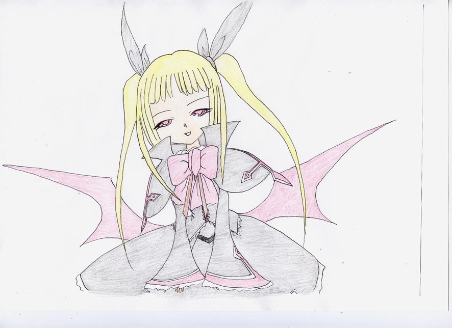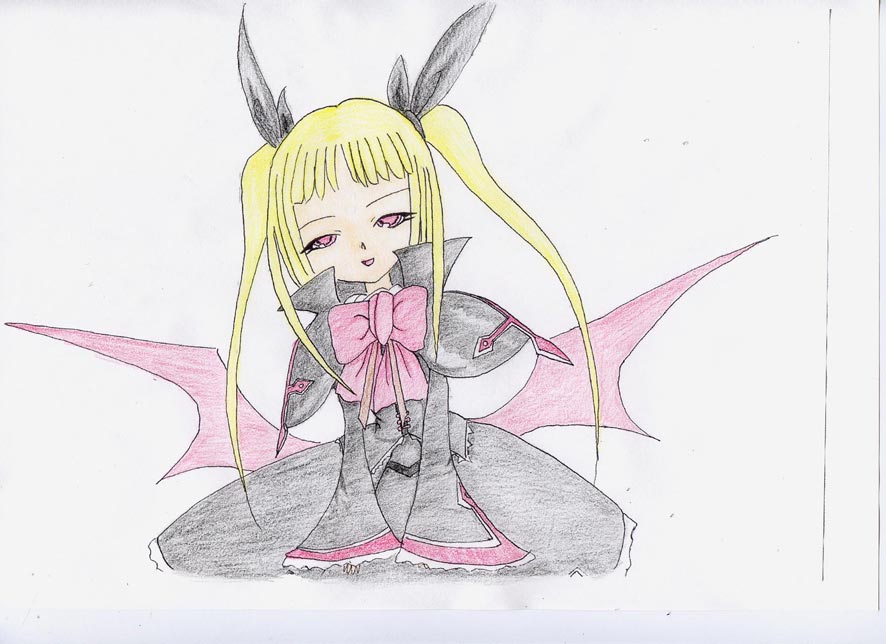 4、で、ハイライトとして肌にオレンジ、髪にオレンジと茶色、瞳にはピンク、服の赤には暗い赤を塗りリボンの影には紫を使ってます。